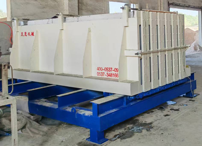 工作原理:模具的開合由下方的液壓機(jī)構(gòu)完成,和墻板機(jī)類似。合模后的鎖緊由上方和兩端的拉桿裝置實現(xiàn)。下方的強(qiáng)制同步裝置保證了大板在開合時的兩側(cè)同步。大板下方的輪組保證了大板在開合時不傾斜、不倒伏。